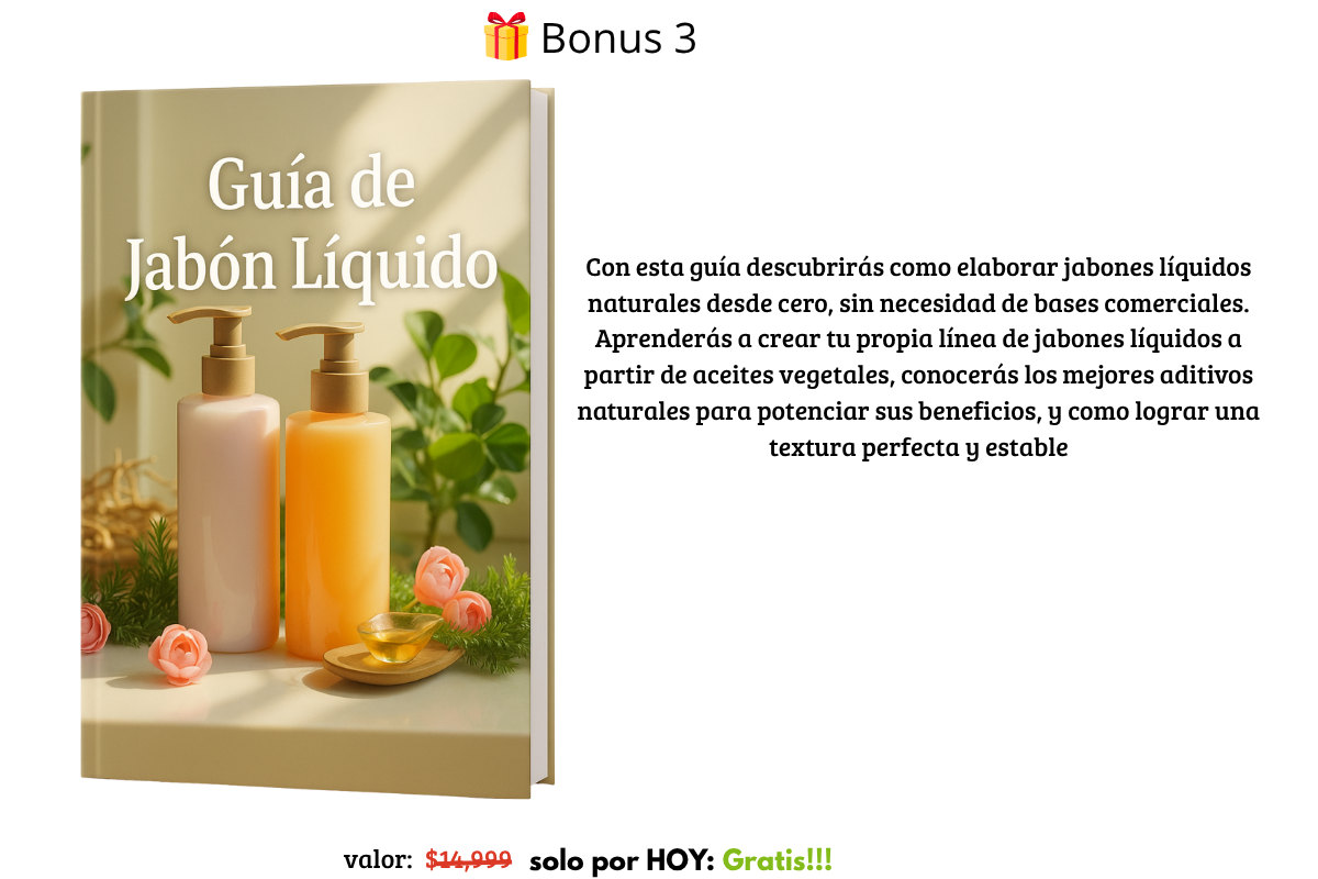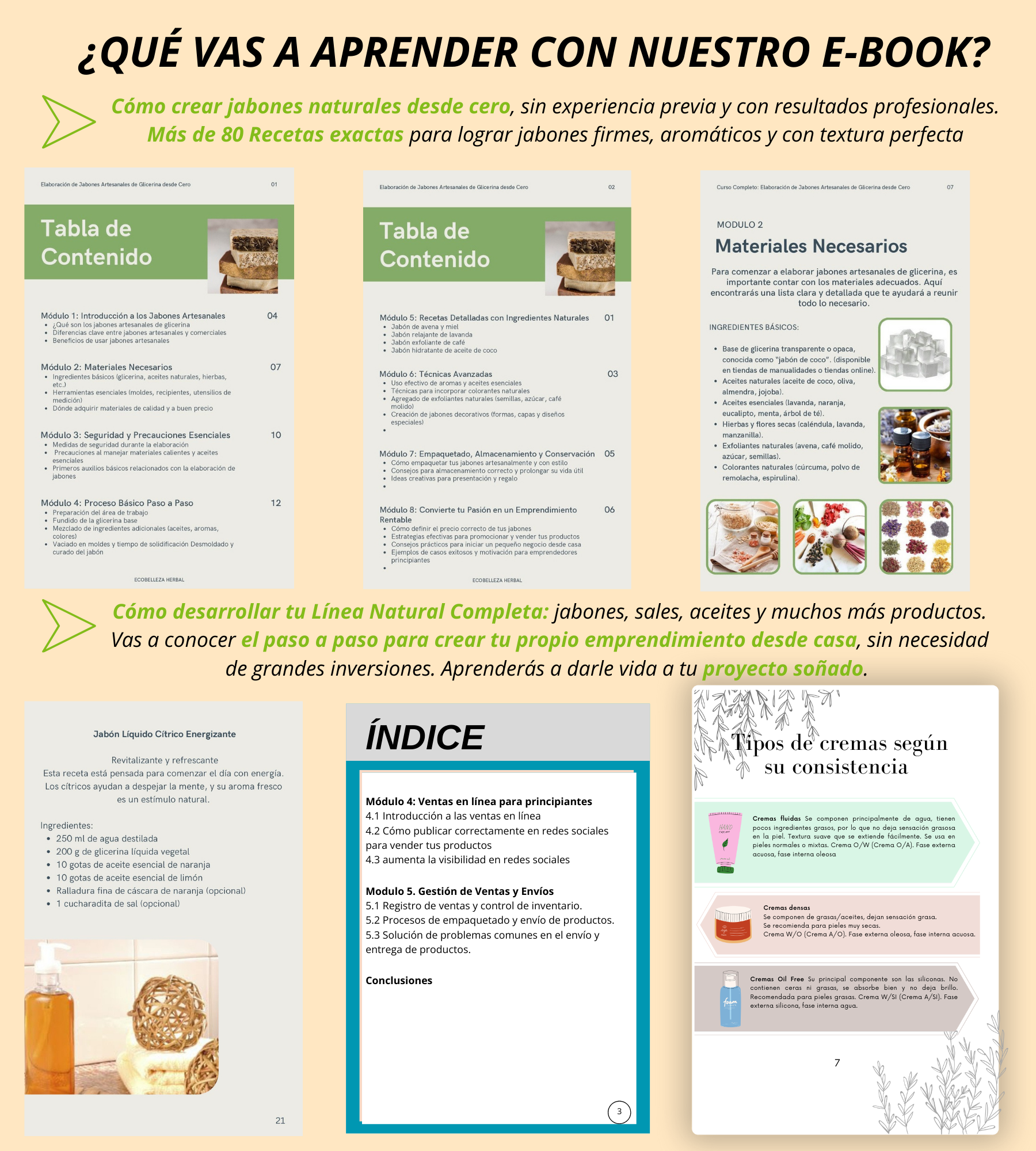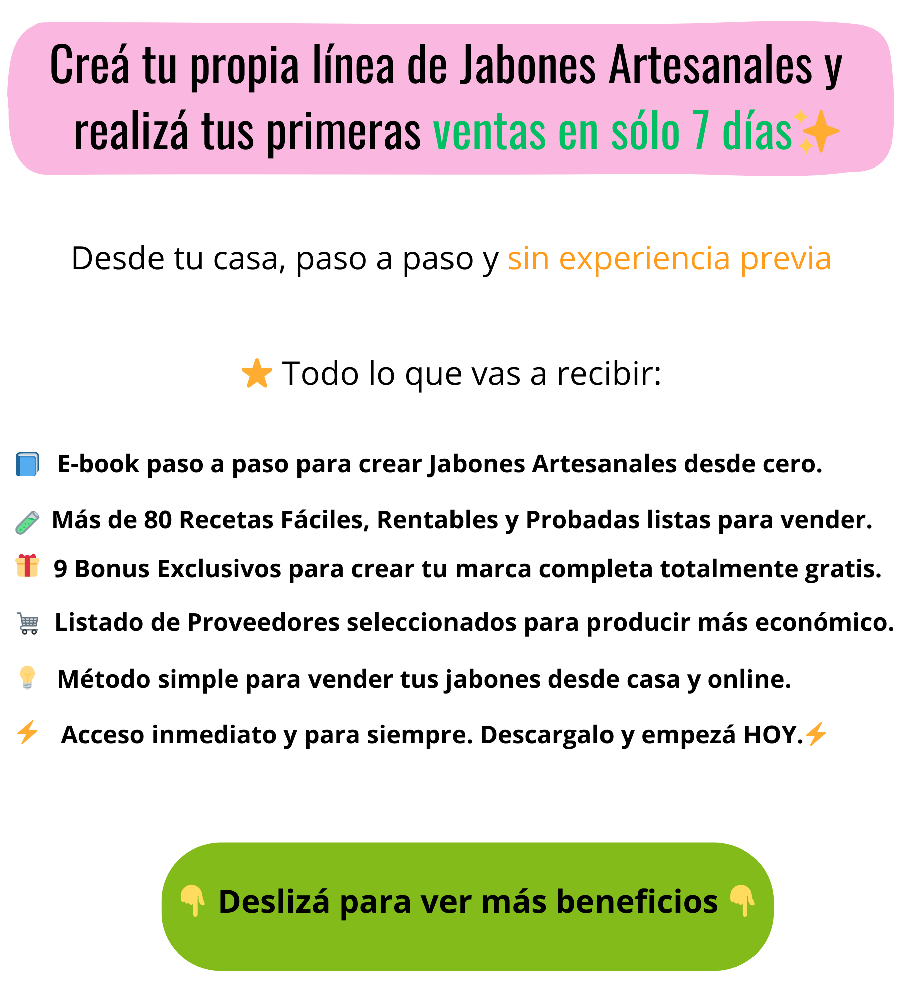 Recibís el E-book Curso de Elaboración de Jabones Artesanales en formato digital (PDF), junto con 9 bonus exclusivos con recetas y guías complementarias para crear tu propia línea natural.